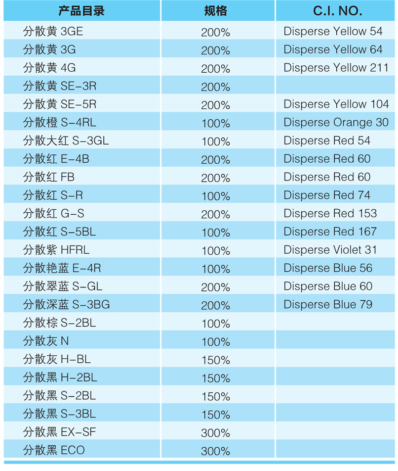 3.    染色性能优良,具有良好的提升力和分散稳定性,色牢度优良。